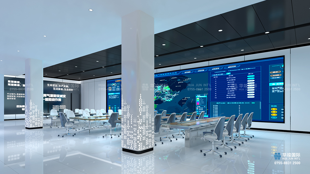 以現(xiàn)代簡約的空間構(gòu)建手法,以氣象和數(shù)據(jù)為空間元素,打造簡約大氣,重點突出的前廳接待空間。頂部天花用氣象的 LOGO勾勒出整體天花的設(shè)計感,墻面發(fā)光的數(shù)據(jù)表達大數(shù)據(jù)的元素,同步中間光效層層包裹中嵌入一塊LED大屏,播放江西智氣象空間全面的視頻介紹片。有時候也可以作為歡迎屏,切換歡迎詞來使用。