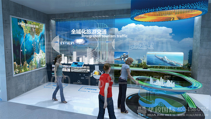 全域旅游交通,以??诋斍爸攸c規劃的美蘭機場、高速公路、跨海大橋等為核心。一方面通過實體模型反映城市交通的立體格局,另一方面結合顯示大屏,全面體現??诮煌ǖ谋憬荩瑸槿蚵糜蔚於ɑA。